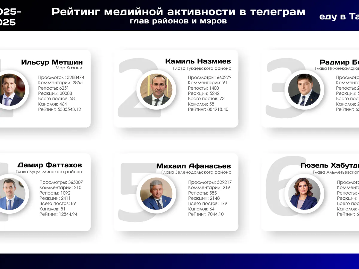 Телеграм-канал «Еду в Татарстан» опубликовал рейтинг самых медиаактивных глав городов и районов республики Татарстан в августе. Специалисты проанализировали активность чиновников в Telegram, упоминания о них, количество просмотров, личные тг-каналы и другие статистические данные.