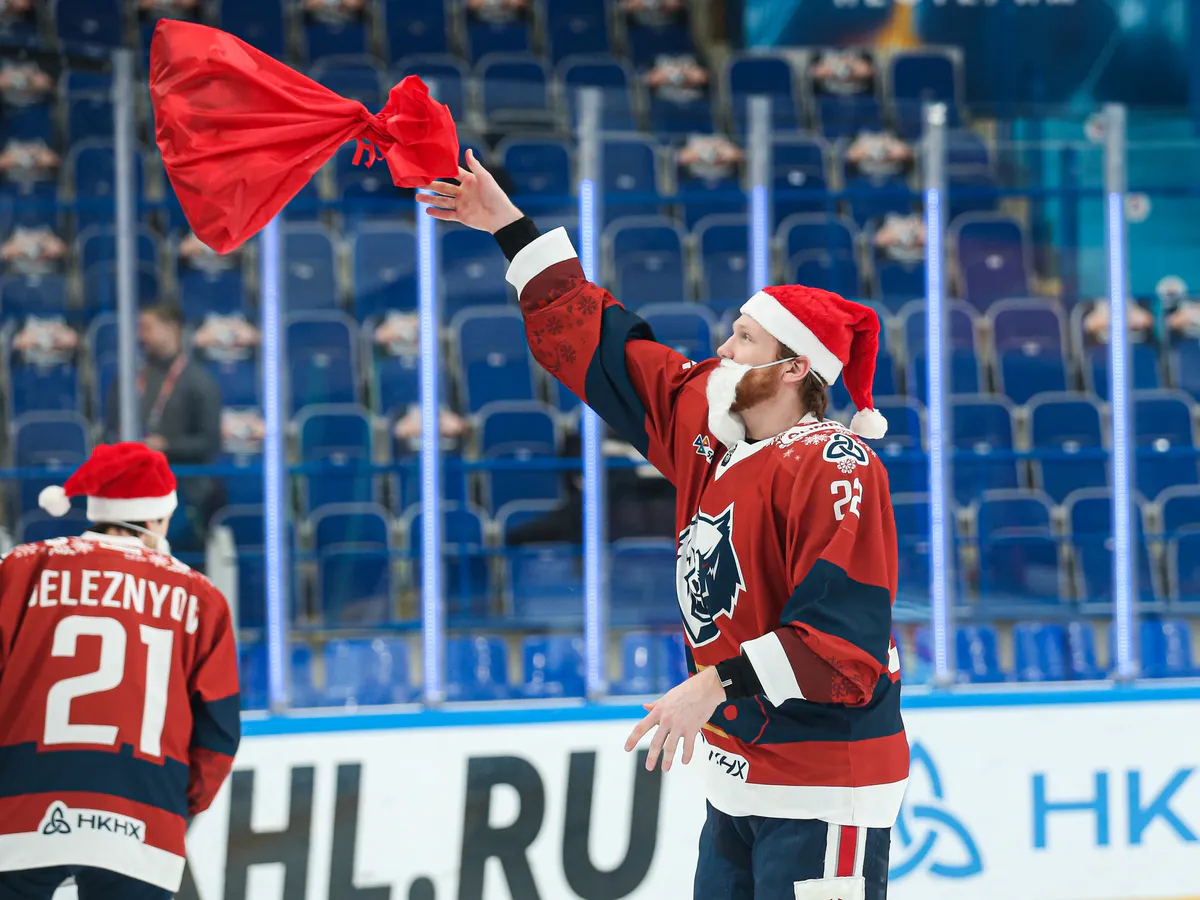 Ещё за 43 минуты до начала игры хоккеисты вышли на раскатку в новогодних джерси, шапочках и с бородами — это стало приятной неожиданностью для болельщиков. Игроки поприветствовали фанатов и забросили на трибуны мешочки с подарками. Часть сюрпризов вручили лично Никита Попугаев, Джозеф Душак и Семён Любавин.