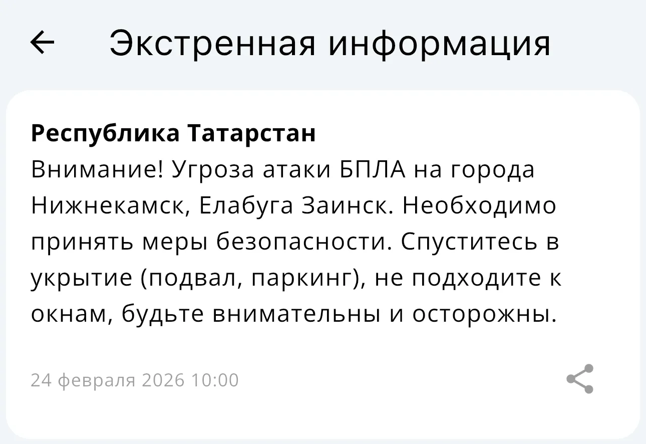 24 февраля в 10:00 МЧС в своем официальном приложении отправило уведомление о том, что на территории Нижнекамска, Елабуги и Заинска угроза атаки БПЛА. Жителям необходимо спуститься в укрытие — подвал либо паркинг, не подходить к окнам и соблюдать меры безопасности.
