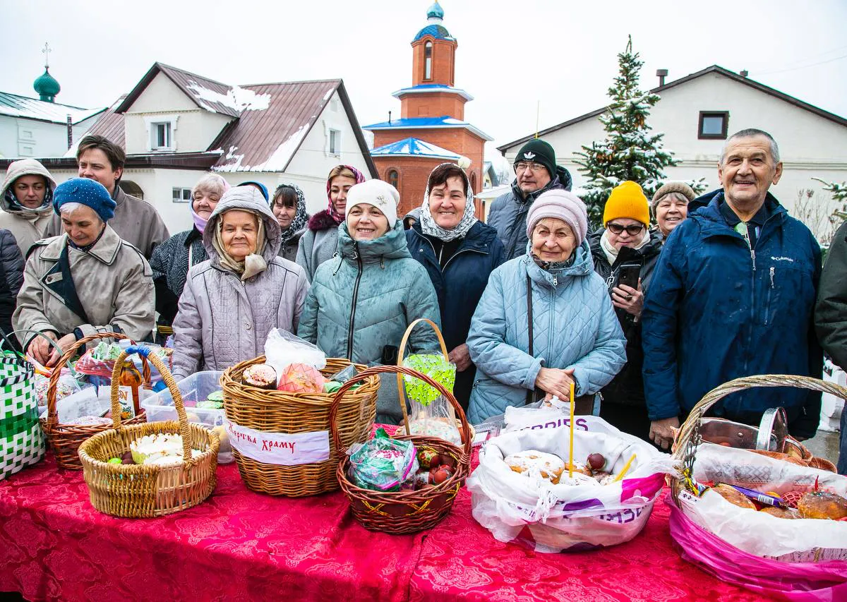 После богослужения епископ Пахомий освятил пасхальные куличи и крашеные яйца. На праздничную службу и освящение пришло много прихожан. Все они принесли свои угощения, чтобы по традиции разговеться после долгого поста.
