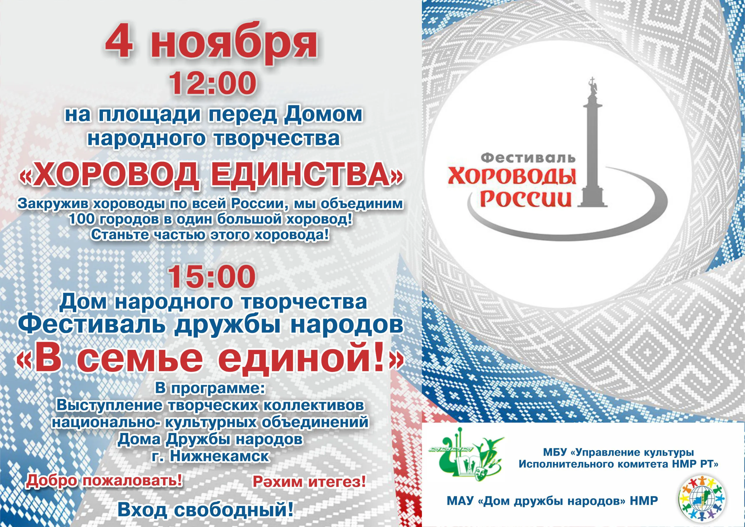 Нижнекамск первый раз будет принимать участие в таком масштабном фестивале. Организаторы праздника приглашают всех жителей и гостей нашего города 4 ноября присоединиться к проекту «Хоровод Единства», который пройдет на площади перед Домом народного творчества в 12 часов дня. Нижнекамск первый раз будет принимать участие в таком масштабном фестивале. Организаторы праздника приглашают всех жителей и гостей нашего города 4 ноября присоединиться к проекту «Хоровод Единства», который пройдет на площади перед Дом