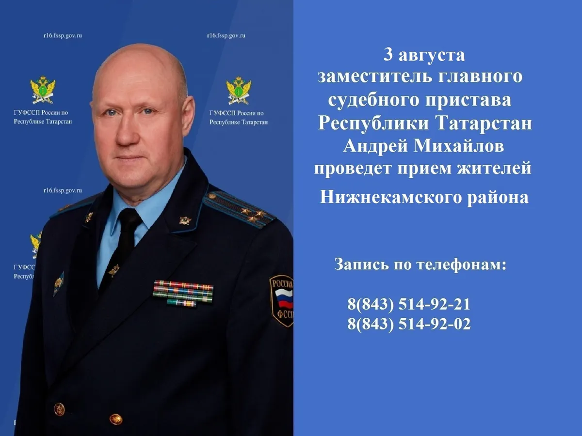 Вниманию нижнекамцев: открыта запись на прием граждан3 августа в отделении судебных приставов Нижнекамского района № 1 пройдет выездной прием граждан. Консультацию проведет заместитель главного судебного пристава Республики Татарстан Андрей Михайлов.Прием пройдет по адресу: г. Нижнекамск, ул. Студенческая, д. 7.Записаться можно по телефонам: 8(843)514-92-21, (843)514-92-02. При себе необходимо иметь паспорт либо нотариально оформленную доверенность (представителям сторон исполнительного производства). Внима