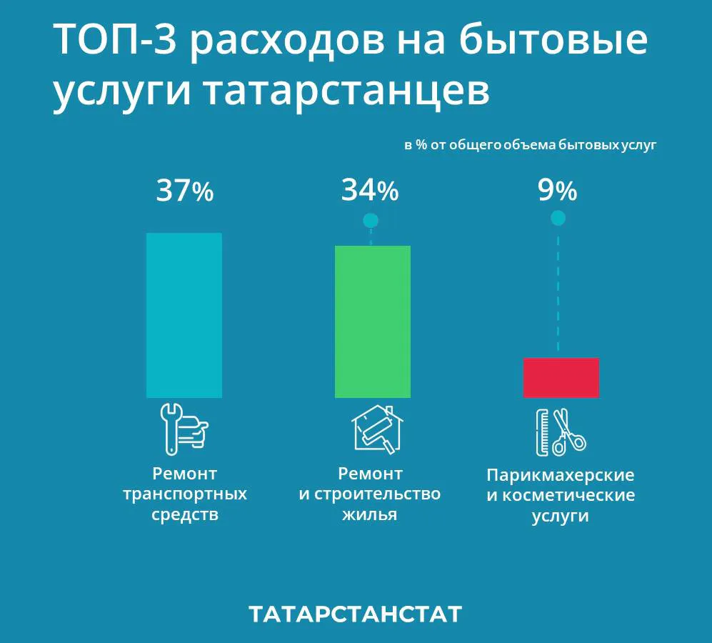 Нужно сделать ремонт в квартире или отремонтировать автомобиль? С таким вопросом сталкивался почти каждый из нас. Бытовое обслуживание важная часть рынка платных услуг и работ для населения.Наибольшую долю в структуре затрат на бытовые услуги татарстанцев в январе-мае 2023 года занимали техническое обслуживание и ремонт транспортных средств, составляя 37%.Второе место занимали расходы на ремонт и строительство жилья –34%.На третьем месте – парикмахерские и косметические услуги в общем объеме бытовых услуг, их доля равнялась 9%.Для сравнения: на услуги саун, бань и душевых приходится 3%, а на услуги химчистки и прачечных – всего 0,4%.Источник – Татарстанстат.