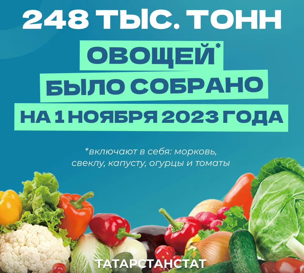 Осенний овощной урожай – долгожданное событие как для фермеров и сельскохозяйственных работников, так и городского населения. На 1 ноября 2023 года собрано 248 тыс. тонн овощей открытого и защищенного грунта, а именно: моркови, свеклы, капусты, огурцов и томатов. Это по 62 кг овощей на одного татарстанца. Средняя урожайность овощей с одного убранного гектара составила 258 центнеров.Источник – Татарстанстат.