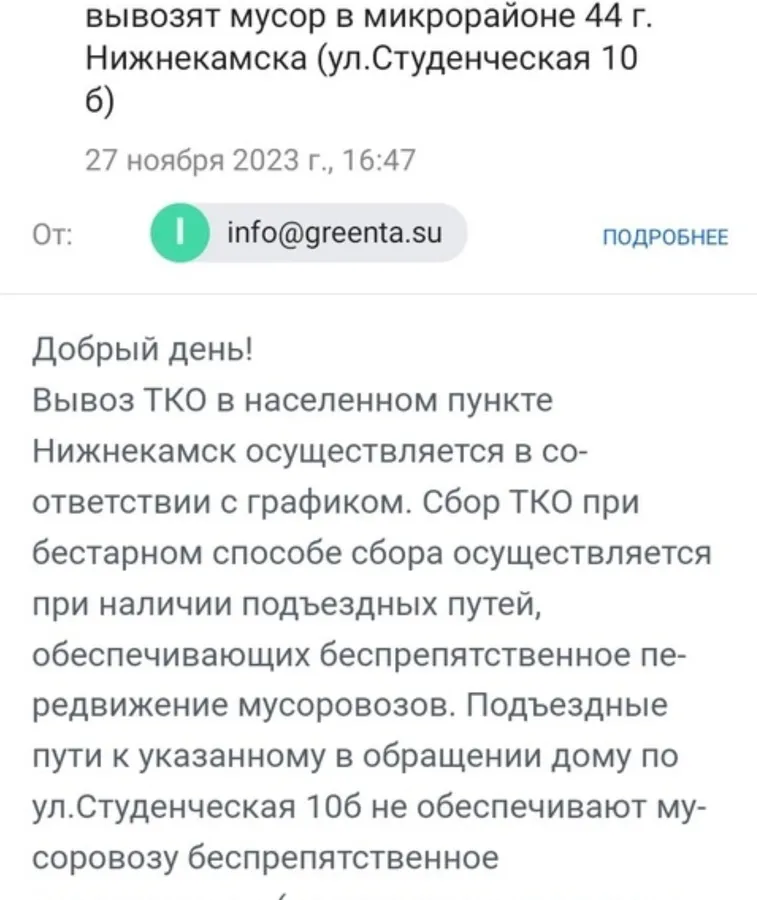 Как сообщили в паблике «Народный контроль», жители Нижнекамска начали массово жаловаться на отсутствие вывоза мусора!В «Гринте» объяснили, что невозможно проехать мусоровозу к местам складирования мусора: «Сбор ТКО при бестарном способе сбора осуществляется при наличии подъездных путей, обеспечивающих беспрепятственное передвижение мусоровозов». Автовладельцы же буквально забаррикадировали дороги. Как сообщили в паблике «Народный контроль», жители Нижнекамска начали массово жаловаться на отсутствие вывоза