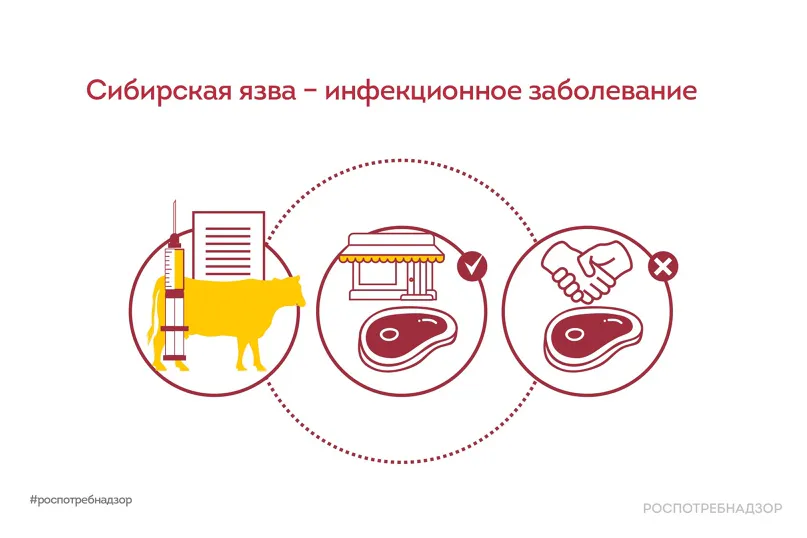 Сибирская язва – инфекционное заболевание, которое характеризуется поражением кожи с образованием черных, похожих на угольки, струпьев и общетоксическими симптомами. Относится к зоонозным, особо опасным инфекциям. Заболевание известно с древних времен и своё название получила ввиду преимущественного распространения в Сибири в дореволюционной России. Источником сибирской язвы для человека являются больные сельскохозяйственные животные.Чтобы избежать заболевания сибирской язвой, Роспотребнадзор напоминает о мерах профилактики:- избегать контакта с дикими животными;- вакцинировать крупный рогатый скот и лошадей против заболевания;- надевать маску при уборке помещений для скота, работе со шкурами, шерстью, пухом и др.;- при подозрении заболевания у животных следует немедленно обращаться к ветеринарному специалисту населённого пункта;- нельзя допускать вынужденный убой животных и разделку туш без ветеринарного освидетельствования;- для исключения заражения не приобретать мясо у частных лиц в местах неустановленной торговли.Возбудитель сибирской язвы не передается от человека к человеку.Источник – Роспотребнадзор РФ.
