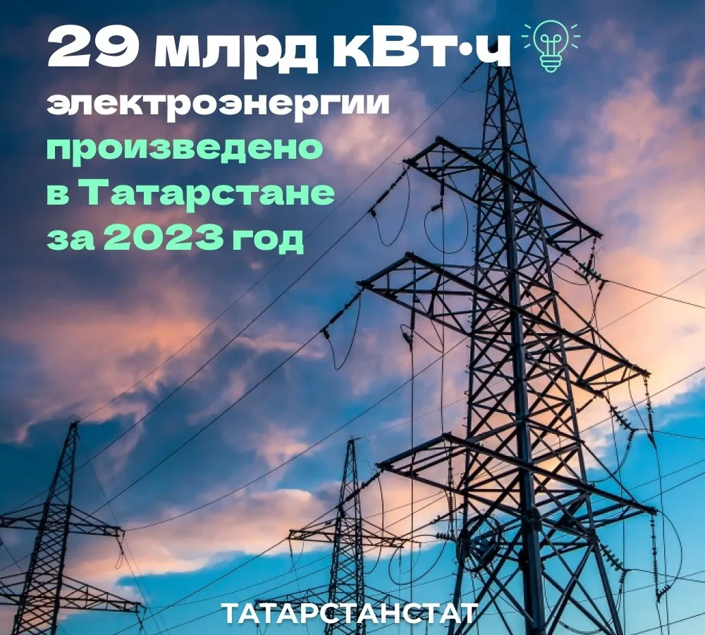 29 млрд кВт·ч электроэнергии произведено в Татарстане за 2023 год, что на 2,1% больше, чем годом ранее.35 тыс. человек, или 2,8% от численности работающих в экономике заняты на 384 организациях энергетического комплекса республики. В рамках выставки «Россия» на ВДНХ проходят мероприятия, посвященные развитию энергетической отрасли страны.Источник – Татарстанстат. 29 млрд кВт·ч электроэнергии произведено в Татарстане за 2023 год, что на 2,1% больше, чем годом ранее.35 тыс. человек, или 2,8% от численности ра