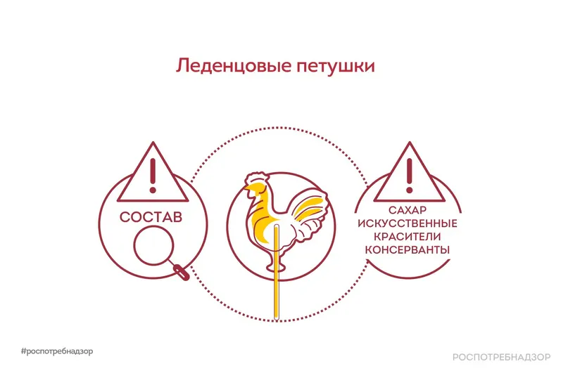 Когда речь заходит о вреде и пользе леденцовых петушков, важно помнить, что эта сладость, как и любая другая, должна употребляться с умеренностью.Главный вред леденцовых петушков связан с высоким содержанием сахара. Пересушенные фрукты и ягоды, из которых они состоят, смешиваются с сахаром и добавками, что может быть вредно для здоровья, особенно для людей, страдающих от сахарного диабета, ожирения и других проблем с обменом веществ. Однако леденцовые петушки также имеют некоторую пользу. Фрукты и ягоды, используемые при их производстве, содержат некоторые полезные вещества. Леденцовые петушки могут стать прекрасной альтернативой другим сладостям, таким как шоколад и конфеты, так как часто они содержат меньшее количество жира и калорий.Роспотребнадзор напоминает, что при покупке леденцовых петушков важно проверять состав продукта. Предпочтение стоит отдавать продуктам, содержащим натуральные ингредиенты.Источник – Роспотребнадзор РФ.