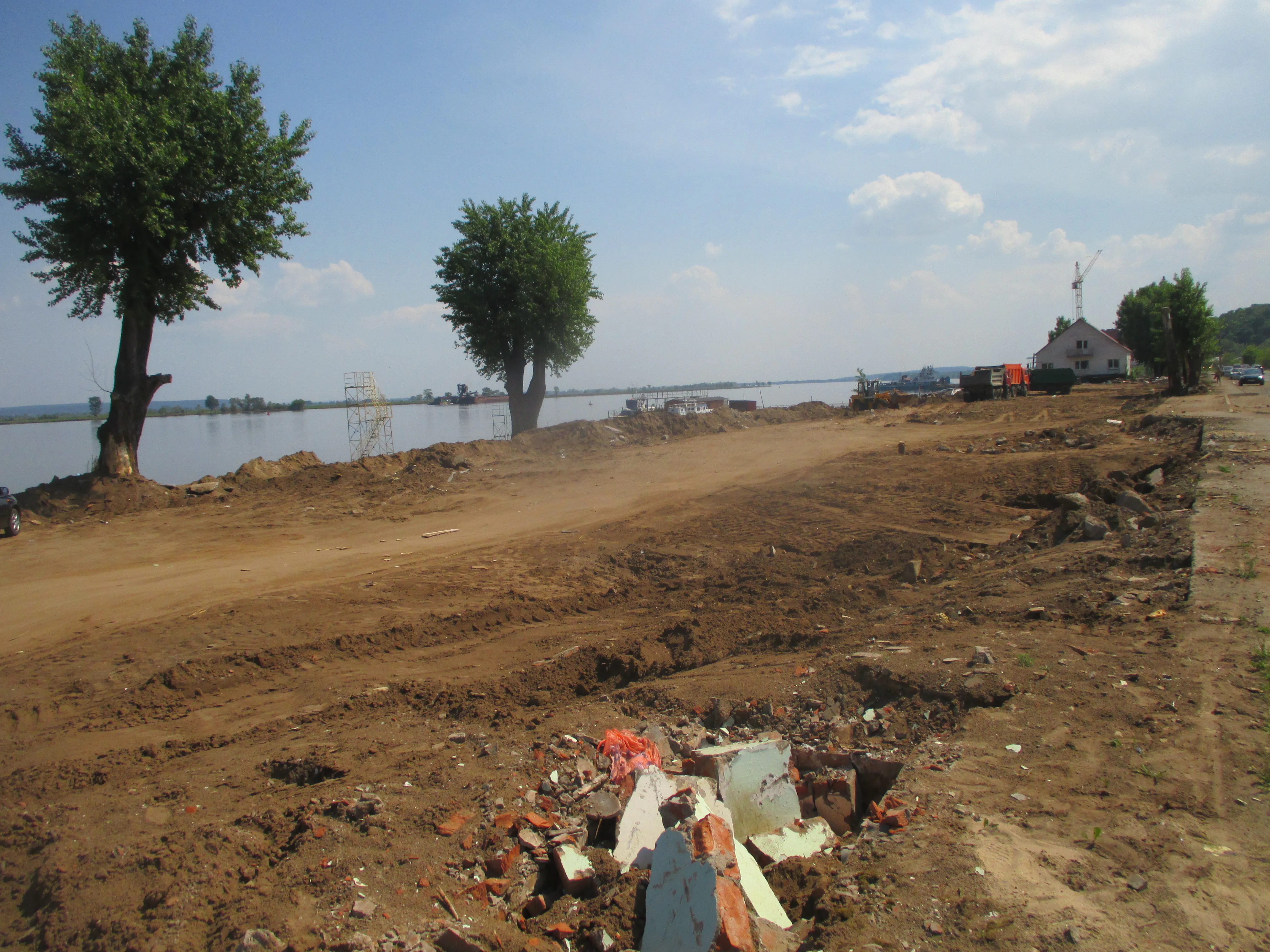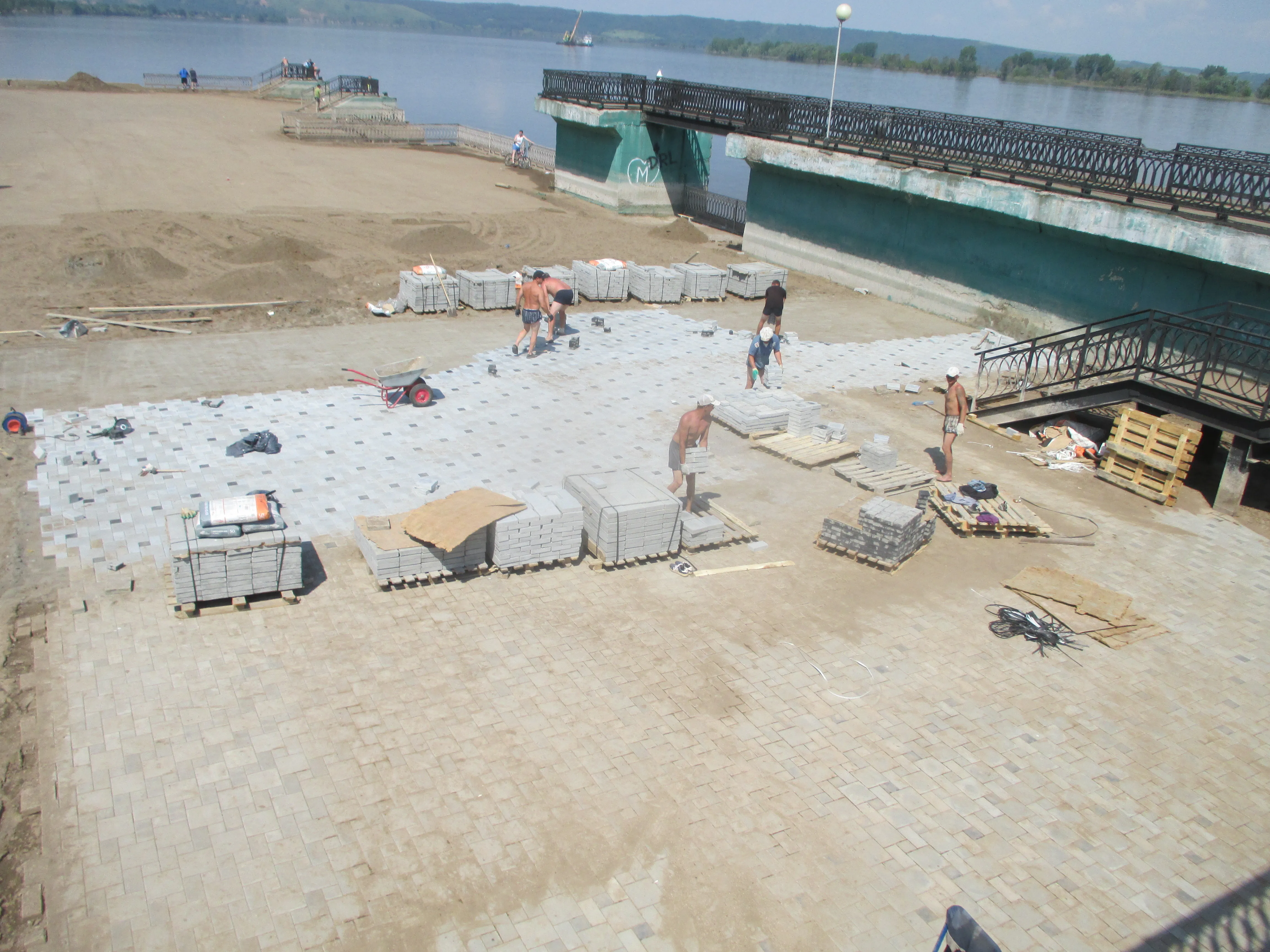 На набережной, где стояли уличные кафе, теперь ничего нет, только деревянный туалет. На пристани рабочие возобновили процесс выкладки брусчатки, которая до недавних пор была скрыта водой. Выложили примерно треть от общего объема.