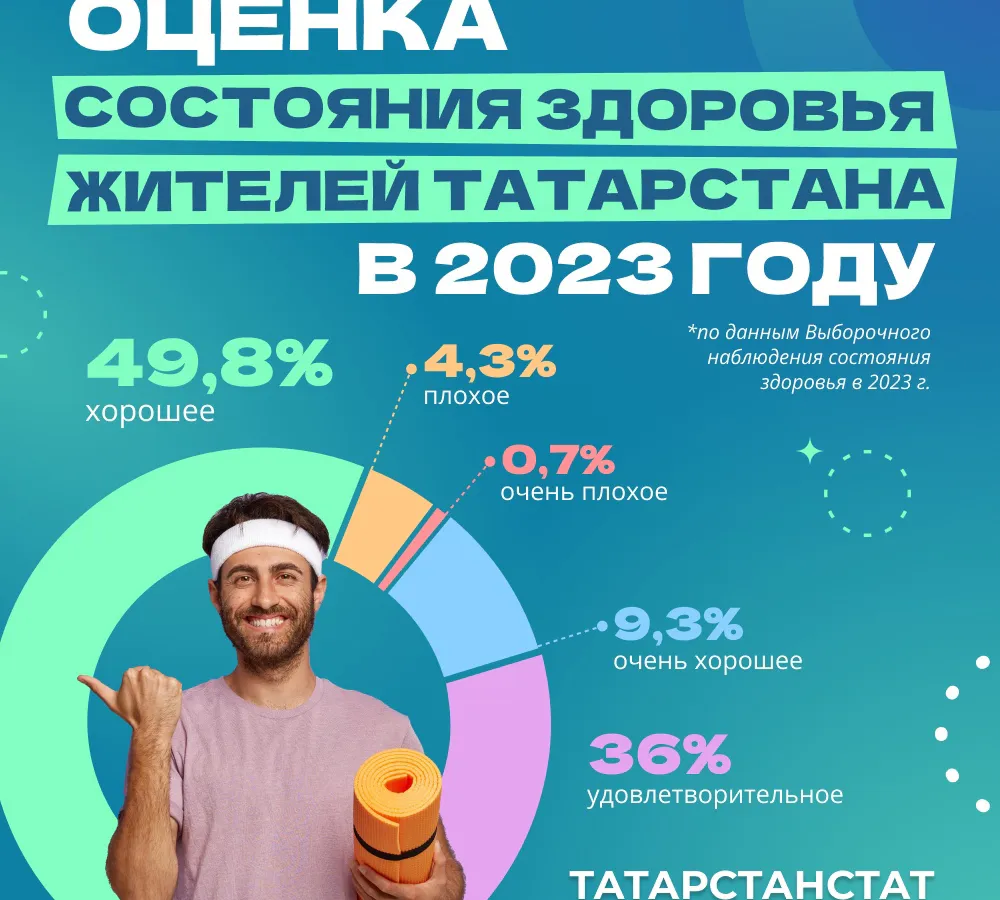 В 2023 году 49,8% жителей Республики Татарстан отметили своё состояние здоровья как хорошее, что превышает среднероссийский уровень (44,9%), и 9,3% – как очень хорошее (в среднем в России – 6,7%).По данным министерства спорта Республики Татарстан, более 2 млн человек в Татарстане регулярно занимаются спортом дома, в спортивных залах или секциях. 11,1% татарстанцев, занимающихся спортом, являются представителями старшего поколения.Регулярные упражнения, здоровое питание и психологическое равновесие помогают поддерживать здоровье. Избегайте стресса, двигайтесь больше, не забывайте про заботу о своем внутреннем мире. Заботьтесь о себе каждый день – ваше будущее в ваших руках!Источник – Татарстанстат.