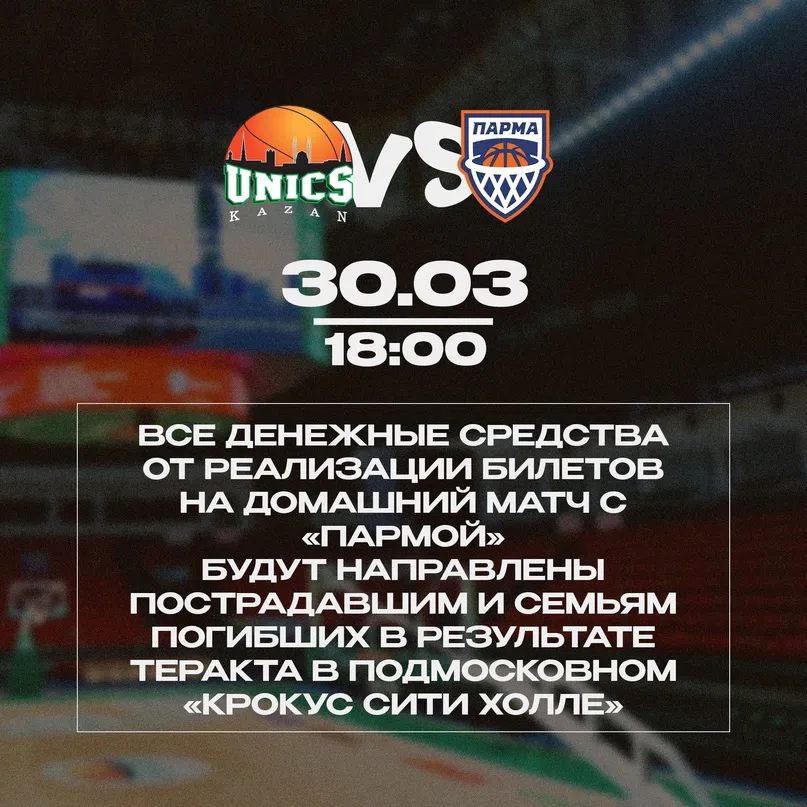 Футбольный клуб «Рубин» передаст все средства с продажи билетов на матч с «Ахматом» жертвам трагедии в «Крокус Сити». Каждый, кто придёт на футбол в это воскресенье, сможет внести свой вклад и помочь пострадавшим в этой страшной трагедии.Аналогичное объявление опубликовал на странице в ВК баскетбольный клуб УНИКС. Спортсмены перечислят все денежные средства от реализации билетов на домашний матч с «Пармой» на помощь пострадавшим и семьям погибших в результате теракта в подмосковном «Крокус Сити Холле». Игра УНИКС – «Парма» состоится в казанском «Баскет-холле» в субботу, 30 марта. Начало – в 18:00. Приглашаем вас на трибуны!