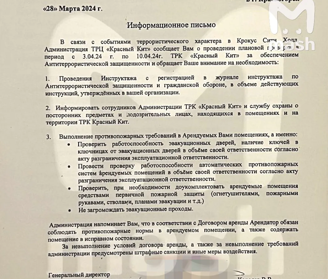 ТЦ обязали пройти специальный инструктаж после трагедии в "Крокусе". Первыми об этом уведомили комплексы в Красногорске. В частности, документ подробно рассказывает, как себя вести, если вас взяли в заложники, чтобы не спровоцировать боевиков. Указан также порядок действий при письменных угрозах, телефонных звонках, вероятности взрыва.