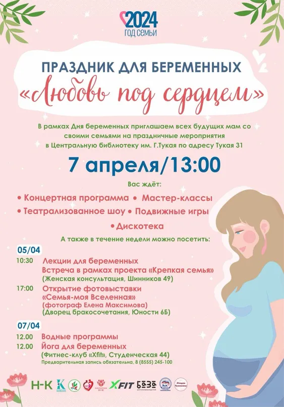 В воскресенье, 7 апреля, в Нижнекамске пройдет праздник для беременных «Любовь под сердцем».Праздник посвящен Всероссийскому дню беременных, который в России отмечается дважды в год – 7 апреля и 7 октября.Будущих мам ждёт концертная программа, мастер-классы, театрализованное шоу, подвижные игры, полезные лекции, йога и другие активности. В воскресенье, 7 апреля, в Нижнекамске пройдет праздник для беременных «Любовь под сердцем».Праздник посвящен Всероссийскому дню беременных, который в России отмечается два