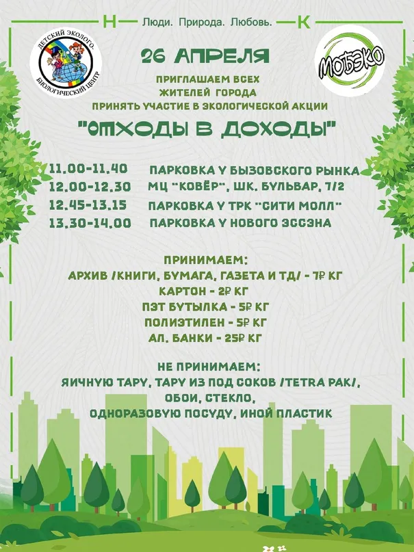 26 апреля в Нижнекамске пройдёт экологическая акция «Отходы в доходы».В пункты приёма нижнекамцы смогут сдать накопившуюся макулатуру. Точки будут работать по всему городу:- с 11:00 до 11:40 – парковка у Бызовского рынка;- с 12:00 до 12:30 – Молодёжный центр инициатив «Ковер» (Школьный бульвар, 7/2);- с 12:45 до 13:15 – парковка у ТРК «Сити Молл»;- с 13:30 до 14:00 – парковка у ТЦ «Эссен» (пр. Строителей, 55). 26 апреля в Нижнекамске пройдёт экологическая акция «Отходы в доходы».В пункты приёма нижнекамцы с