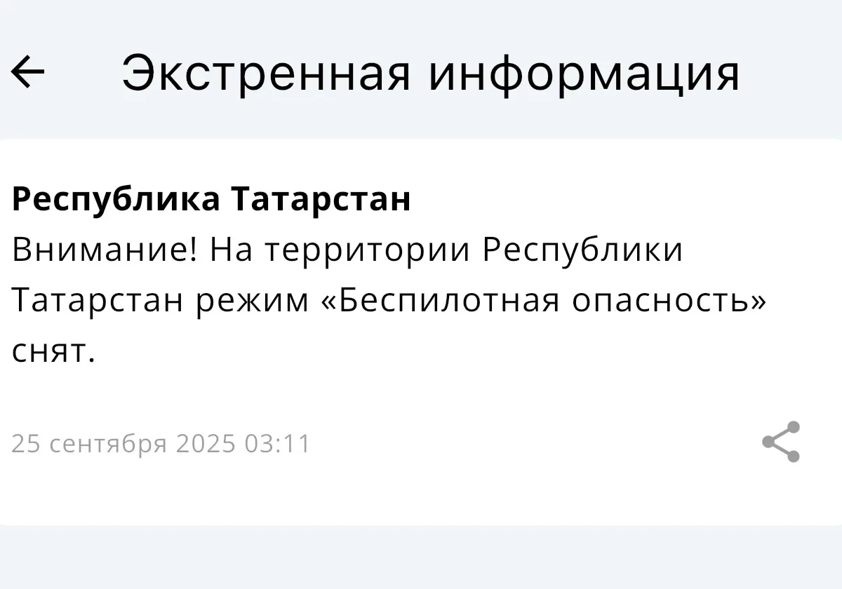 25 сентября в 3:11 в Татарстане сняли режим «Беспилотная опасность». Такое сообщение появилось в официальном приложении МЧС. Режим действовал с 19:30 24 сентября.