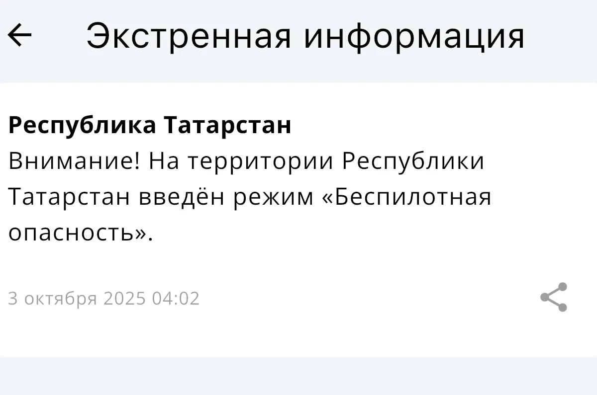 3 октября в 4:02 в приложении МЧС появилось уведомление о том, что на территории Татарстана объявлен режим беспилотной опасности. Напомним, что вчера также аналогичный режим действовал почти 4 часа.