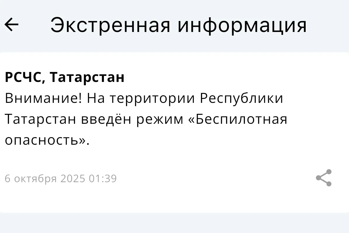 В 1:39 в официальном приложении МЧС появилось сообщение о том, что на территории Татарстана введен режим «Беспилотная опасность». О других ограничениях не сообщаетс. Аэропорты работают в штатном режиме.