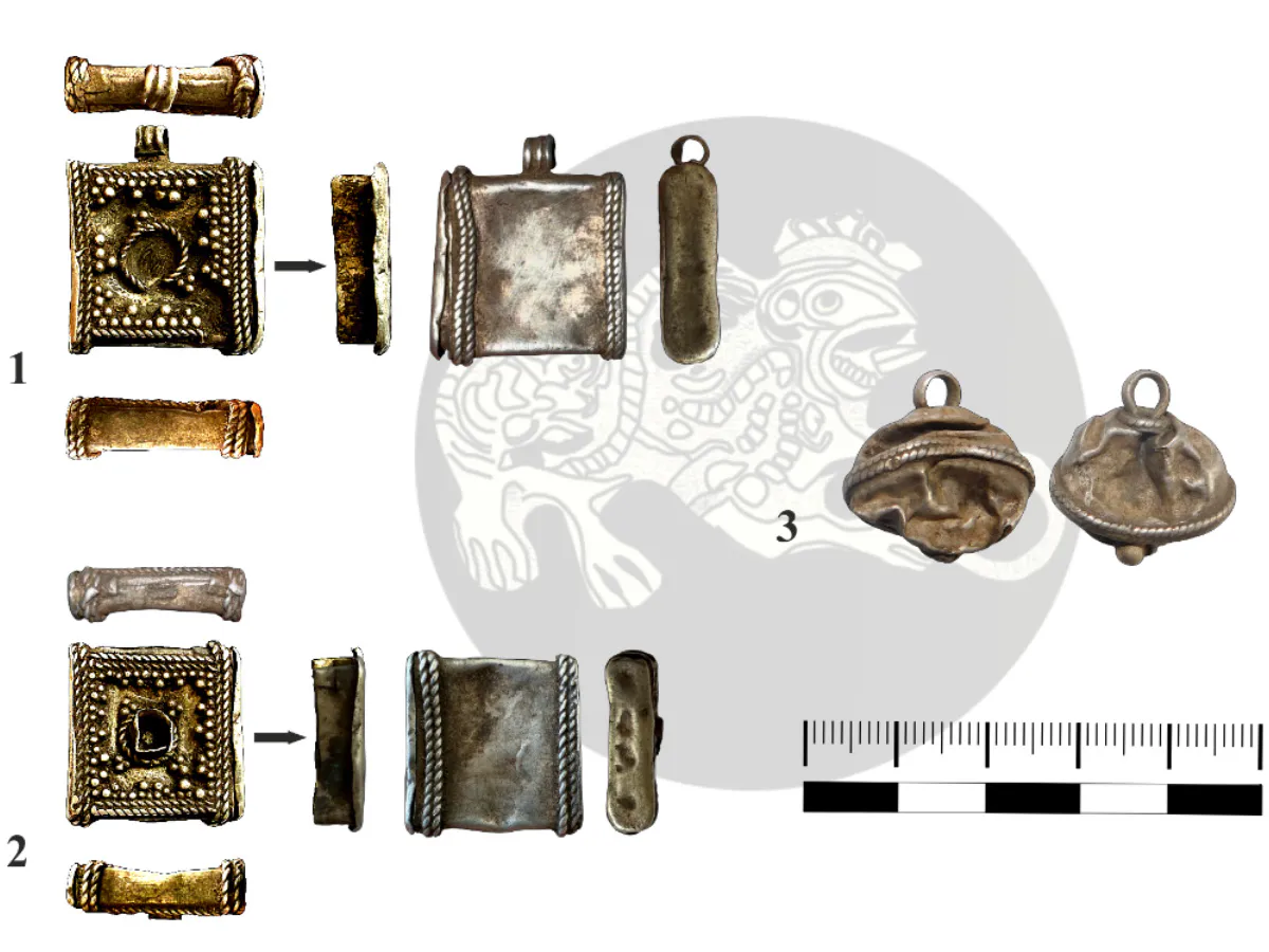 Древние артефакты представляют собой оригинальные амулетницы, изготовленные из высокопробного серебра. Эти уникальные изделия имеют размеры 2,1×2 см и 2×1,9 см, выполнены в подквадратной форме с полым пространством и узкими пластинчатыми заглушками.