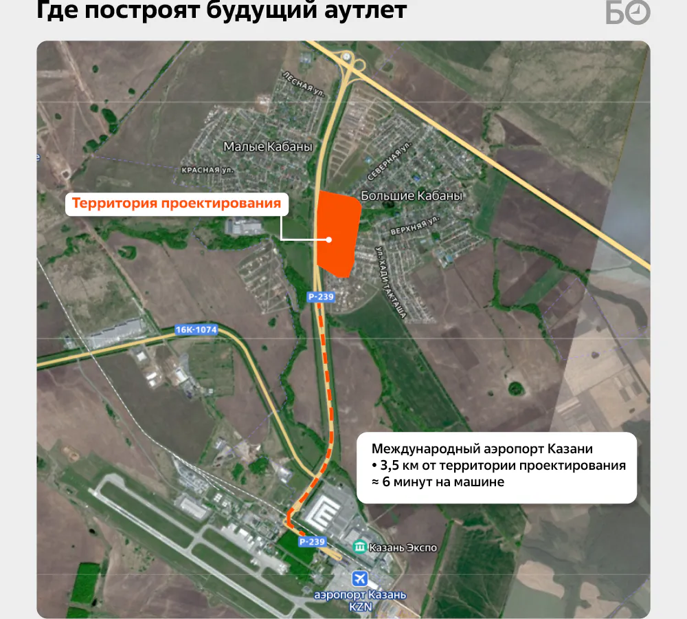 В Татарстане готовится к реализации масштабный торговый проект: неподалёку от села Большие Кабаны (в 3,5 км от казанского аэропорта) планируется построить первый в регионе и во всём Поволжье полноценный аутлет. Информацию об этом обнародовал «БИЗНЕС Online».