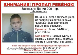 14-летний Данил Закваскин и 16-летний Никита Куликов вышли из здания центра в 18 часов на прогулку. До настоящего времени о них ничего неизвестно. Информация об этом распространена в группе Нижнекамск ВКонтакте и группе поиска «След». Всех, кто владеет информацией о местонахождении подростков, просят позвонить по телефонам: 02, 8 (917) 271-91-71.14-летний Данил Закваскин и 16-летний Никита Куликов вышли из здания центра в 18 часов на прогулку. До настоящего времени о них ничего неизвестно. Информация об это