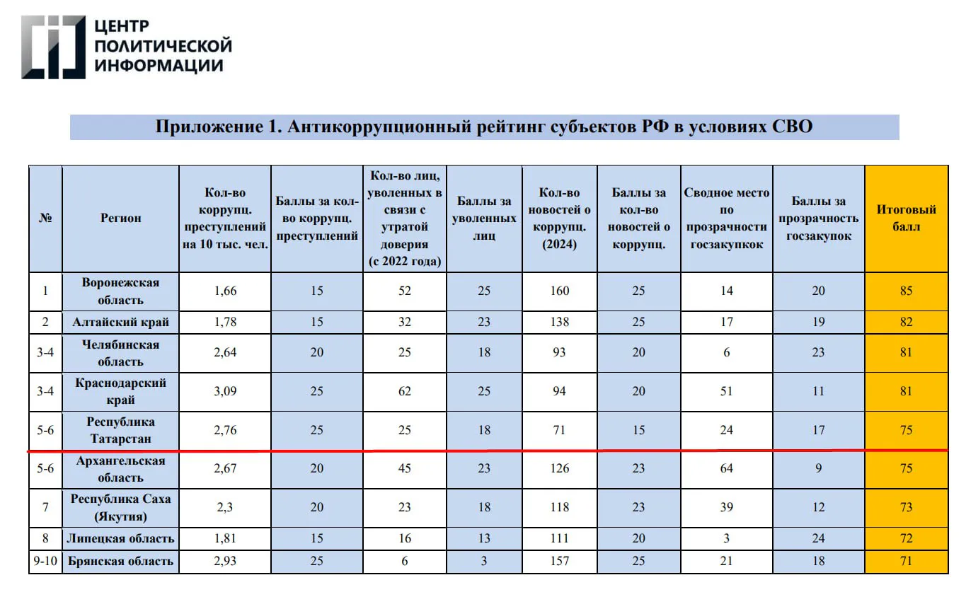 В январе 2026 года Центр политической информации опубликовал антикоррупционный рейтинг субъектов РФ в условиях СВО. Татарстан вошёл в первую десятку регионов, где наиболее эффективно ведётся борьба с коррупцией.