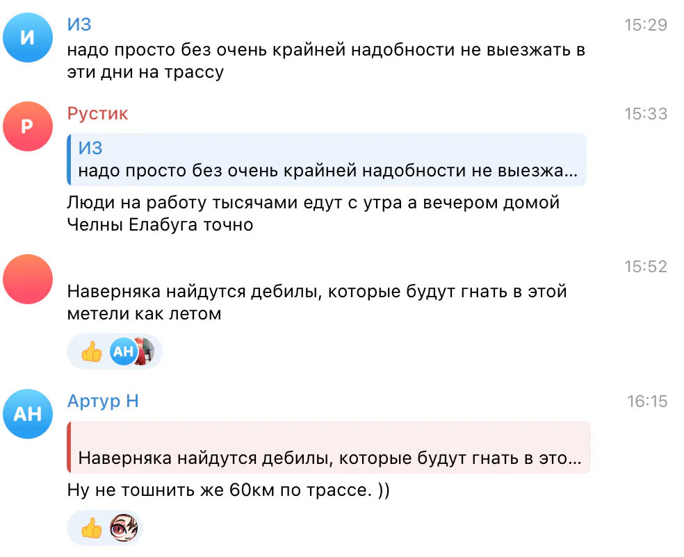 Также напоминаем, что 28 января закрыли три трассы для грузовиков и автобусов, и Госавтоинспекция рекомендует водителям не выезжать за город при острой необходимости. Реакция татарстанцев на это неоднозначная:
