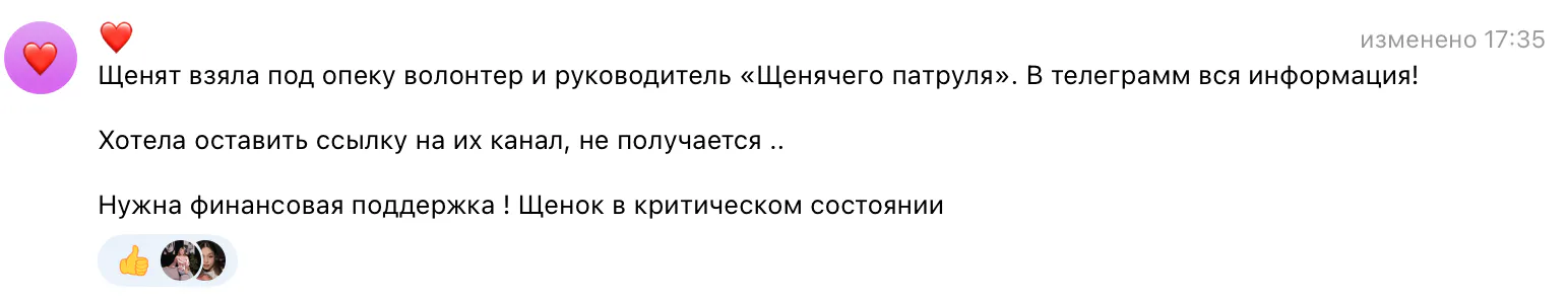 В комментариях под постом в телеграм-канале Mash Iptash один из читателей написал, что щенок в критическом состоянии, ему нужна финансовая помощь.