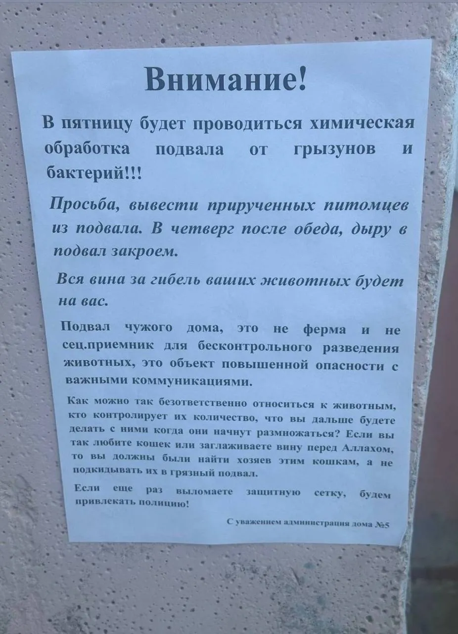 Как рассказали сами жильцы, в подвале уже раскидали крысиный яд. Со стороны администрации дома объясняют: это обычная дератизация, борьба с грызунами. Но люди уверены — крыс там нет, а так хотят избавиться от кошек, которые давно живут внизу.