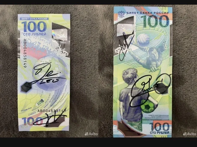 Автор объявления рассказал, что футболисты расписывались на купюре в разное время летом 2018 года. Леонель Месси оставил автограф 30 июня. Тони Кросс — 27 июня. Килиан Мбаппе — 16 июня. А Неймар — 6 июля.