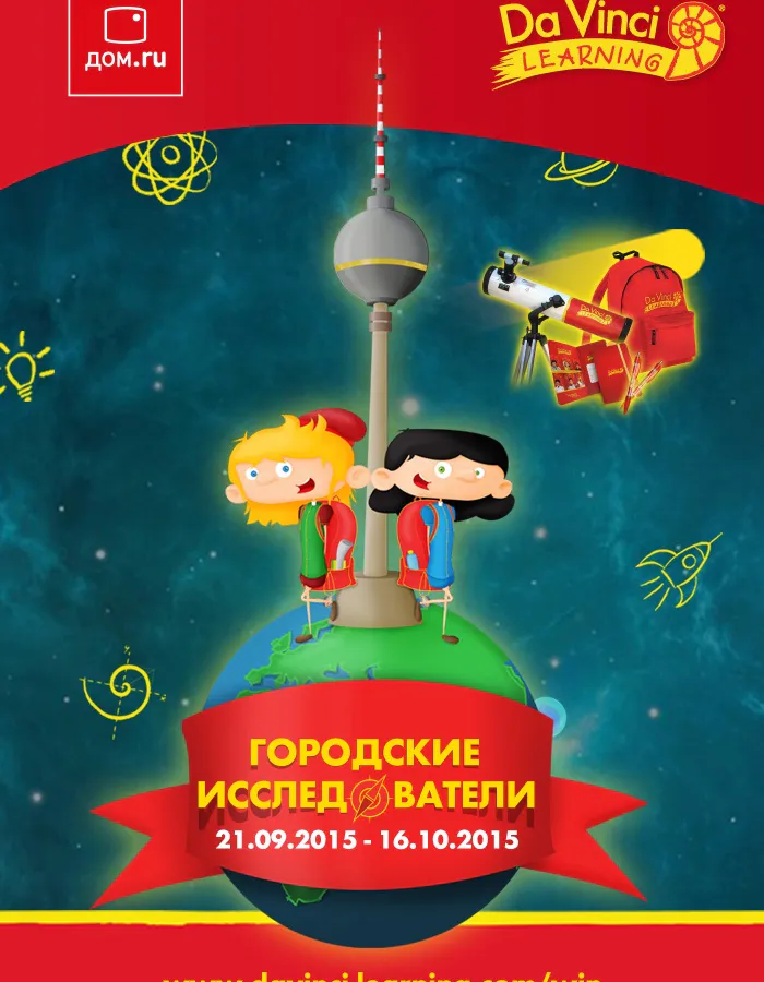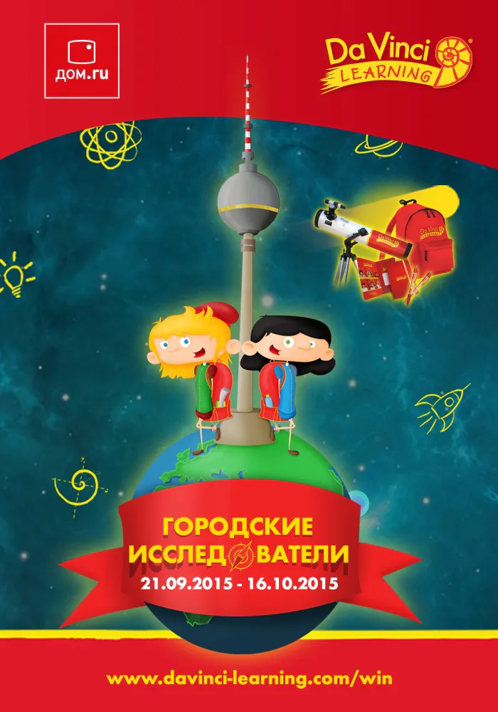 Чтобы побороться за приз, достаточно до 16 октября 2015 года зарегистрироваться на сайте www.davinci-learning.com/win и ответить на простой вопрос. Победителей определят путем случайного выбора среди правильно ответивших участников. Призом за 1-место станет поездка на четверых - 2 взрослых и 2 детей в возрасте до 12 лет - в Берлин с увлекательным квестом по городу (организаторы оплачивают проживание и перелет). За 2-е место участник получит телескоп с высокими техническими характеристиками, за 3-е место – школьный набор, в который входят рюкзак, блокнот, набор для рисования и калькулятор.