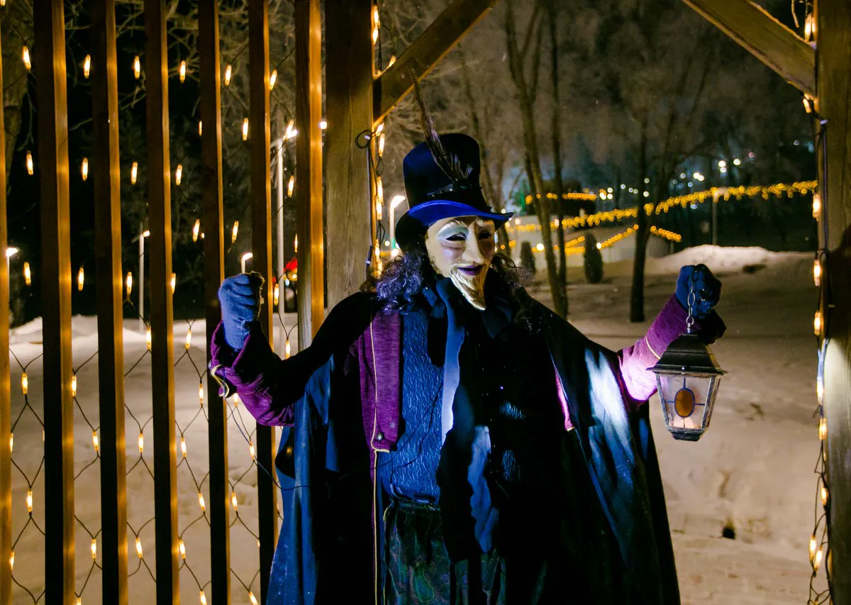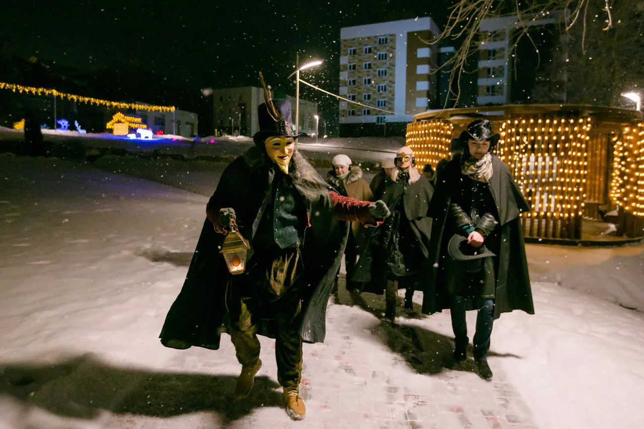 Сказочный фонарщик в цилиндре и плаще рассказывает о возникновении города, поселка Красный Ключ, купцах Стахеевых, нижнекамском художнике Ахсане Фатхутдинове, пещере, в которой молился имам и другие истории.