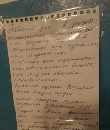 «Табачный дым в помещениях вдыхают все, и его вредному воздействию подвергаются как курильщики, так и некурящие люди!!! <...> Рядом с вами вдыхают табачный дым ваши дети, жены, близкие, соседи. Вы убивайте всех окружающих и себя».