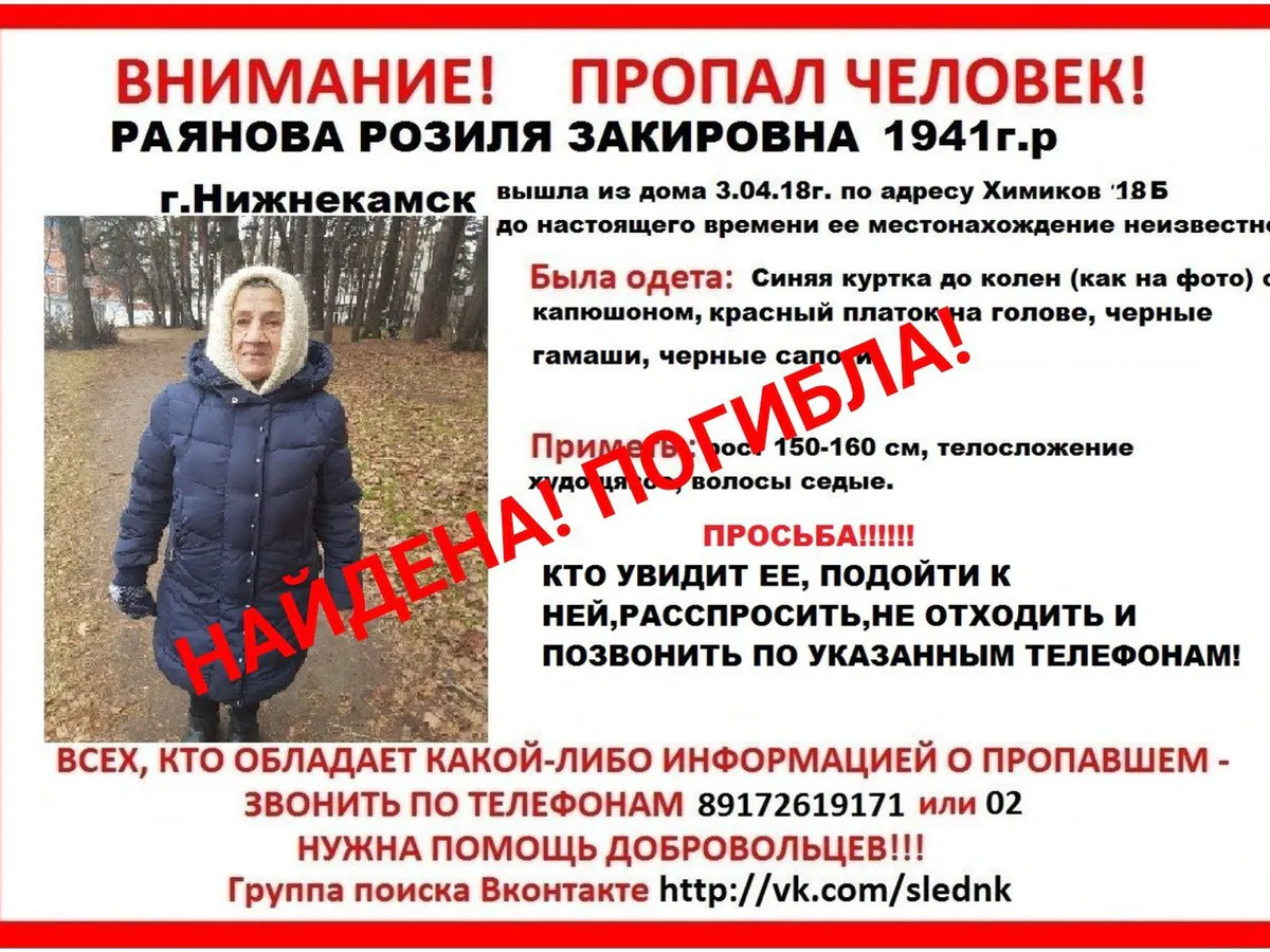 Информацию о том, что пропавшая бабушка найдена и погибла, разместили вчера в своей группе в «ВКонтакте» волонтеры-поисковики из отряда «След». 76-летнюю бабушку волонтеры обнаружили недалеко от коттеджного поселка на ул. Сююмбике в лесу. Сейчас расследованием этого дела занимаются полицейские. Тем временем продолжаются поиски ещё одного человека. Подробная информация – на фото. Фото: vk.com/slednk Информацию о том, что пропавшая бабушка найдена и погибла, разместили вчера в своей группе в «ВК