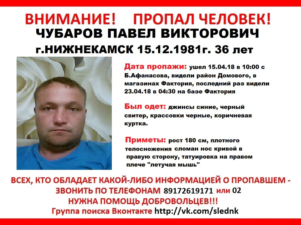 В соцсетях появились посты с приметами пропавшего. Мужчине 36 лет, рост 180 см, плотного телосложения. Сломан нос (кривой в правую сторону), имеется татуировка на правом плече - летучая мышь.Нижнекамец ушел из Большого Афанасова 15 апреля этого года в 10 утра. Затем его видели в районе магазина "Домовой", в магазинах "Фактория" и последний раз - 23 апреля около 4-х утра на базе Фактория. Пропавший был одет в синие джинсы, черный свитер, черные кроссовки и коричневую куртку.Всех, кто располагает информацией