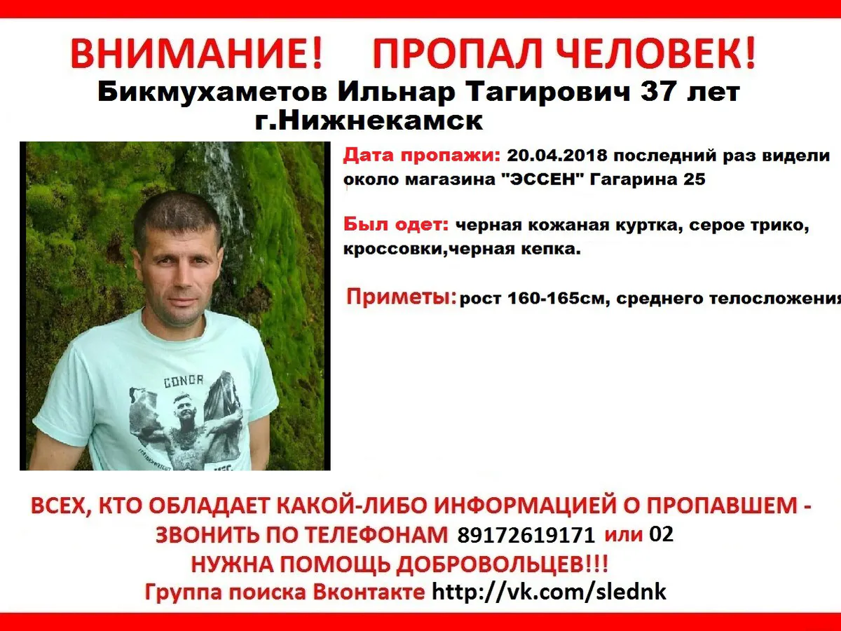Поисково-спасательный отряд "След" разместил на своей странице в соцсети ВК информацию об очередном пропавшем нижнекамце. Разыскивается Бикмухаметов Ильнар Тагирович, ушел и не вернулся 20 апреля. В последний раз мужчину видели около магазина "Эссен" на Гагарина, 25.Был одет в черную кожаную куртку, серое трико, кроссовки и черную кепку. Рост 160-165 сантиметров, среднего телосложения.Всем, кто видел нижнекамца, просьба позвонить по телефонам: 02 и 8-917-261-91-71. Нужна помощь добровольцев в поисках, телеф