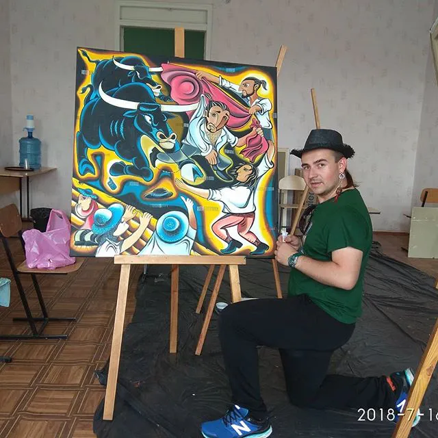 Все участники жили за городом на базе отдыха. У каждого была своя комната. За 10 дней мы должны были на предложенную тему – «Народные игры и забавы», изобразить что-то своё, национальное. Я изобразил «Энсьерро» – это разновидность корриды, когда разъяренных быков выпускают на специально оборудованные улицы города, и животные начинают преследовать бегущих людей. Это довольно рискованное и опасное занятие. Картина написана маслом, её размер – метр на метр.