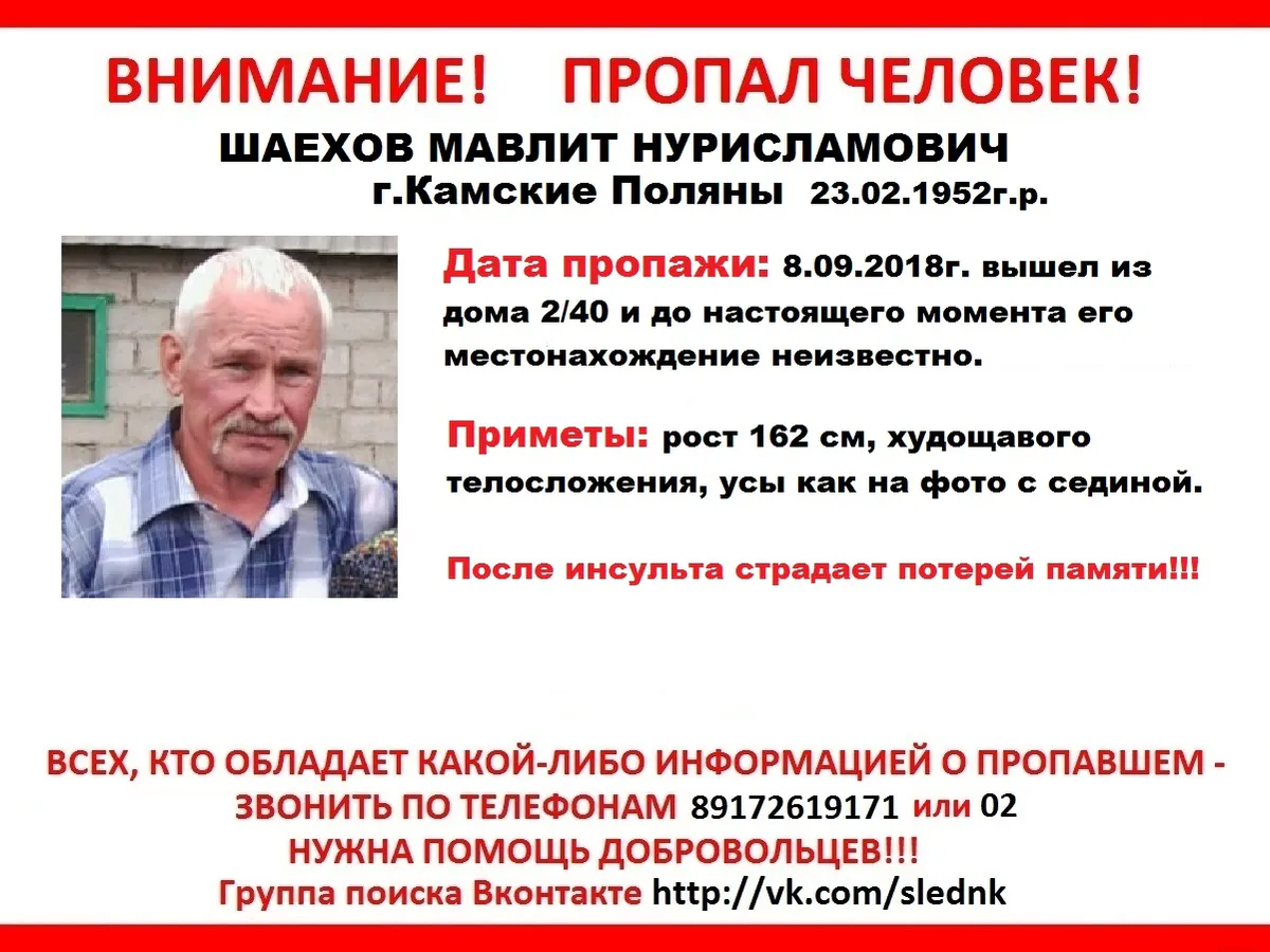 8 сентября мужчина вышел из дома в Камских Полянах, и до сих пор о нём нет никакой информации. В группе поисково-спасательного отряда «След» указано, что после инсульта мужчина стал страдать потерей памяти. Приметы пропавшего: рост – 162, худощавого телосложения, носит усы (с сединой, как на фото). Поисковики отмечают, что мужчина может оказаться в Нижнекамске, поэтому горожан просят быть внимательными, а узнав что-то, немедленно сообщать по номерам: 8-917-261-91-71 или 02. Фото: vk.com/slednk 8 сен