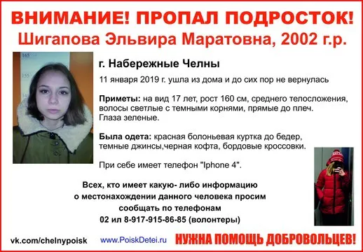 Напомним, что несовершеннолетняя ушла 11 января из дома 26/12 и до настоящего момента найти ее не удалось. На вид ей 17 лет, рост 160 см, среднего телосложения, волосы крашеные, светлые, с темными корнями, прямые до плеч, глаза зеленые. Была одета в красную болоньевую куртку до бедер, темные джинсовые брюки, черную кофту, бордовые кроссовки. При себе имеет телефон iPhone 4. Шигапова — учащаяся Камского экономико-правового колледжа.