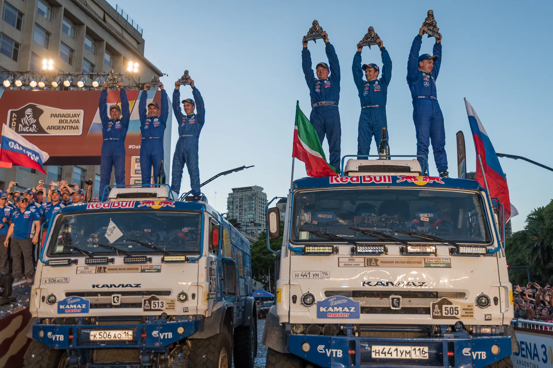 Команда «КАМАЗ-Мастер» стала 14-кратным победителем «Дакара». Два экипажа под управлением Эдуарда Николаева и Дмитрия Сотникова взяли два первых места.Кроме того, первое место в зачете квадроциклов взял еще один россиянин — Сергей Карякин.Более того, третье место в классе багги занял дебютант «Дакара» Равиль Маганов, сын гендиректора ПАО «Татнефть» Наиля Маганова.Закончились еще одни традиционные новогодние гонки - Africa Eco Race. В зачете грузовиков с первого до последнего этапа лидировал экс-чемпион “Дак