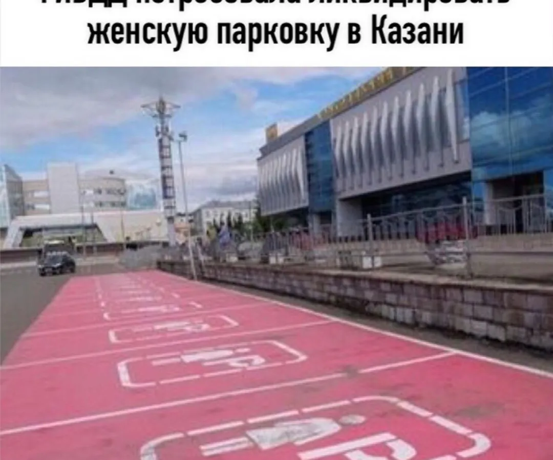 В Казани открылась специальная женская парковка у центрального универмага. Строительство первой парковки для женщин руководители ТЦ объяснили тем, что большинство покупателей - женщины. Отличие парковки для женщин от обычной заключается в том, что парковочные места выкрашены в розовый цвет, а их ширина составляет 4 метра (стандарт 2,5 метра). Видимо, владельцы ТЦ считают, что женщины настолько плохо паркуются, что им нужно больше места для маневра. - Понятия мужская или женская парковка в правилах дор