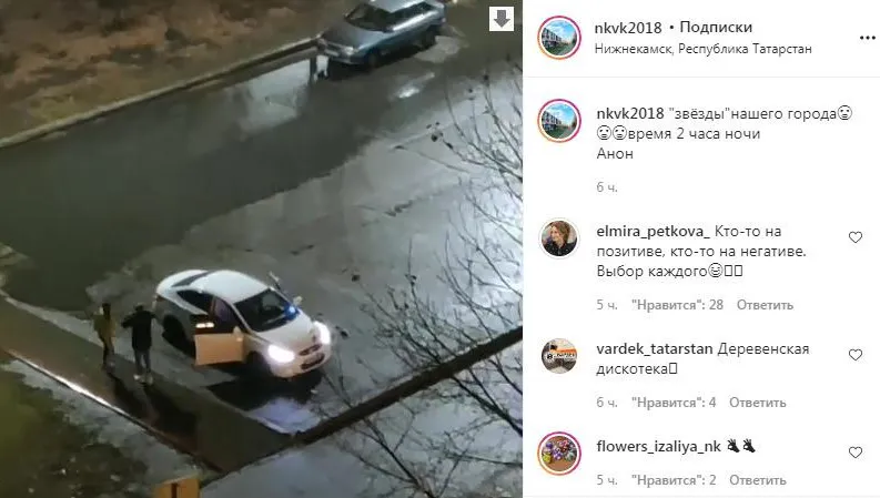 Большинство комментаторов поддерживают и подбадривают уличных танцоров.Танцующая у машины молодежь в Нижнекамске субботним днем стала самой обсуждаемой темой в одной из крупных городских групп в Инстаграме. На видеокадрах, снятых возмущенным жителем близлежающего к «дискотеке» доме, видно, как молодые люди включили в машине музыку, открыли двери и танцуют под «За тебя калым отдам» Мурата Тхагалегова. Видео длится всего несколько секунд. По словам автора, сие действо происходило в два часа ночи. «Как же вс