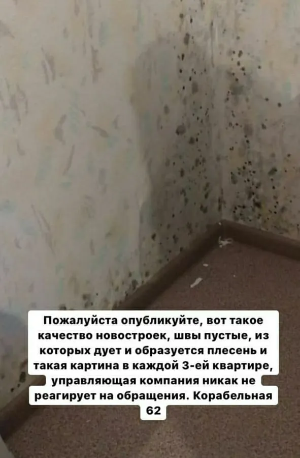 Житель Нижнекамска продемонстрировал, как выглядит его квартира, которую он недавно купил в новом доме на улице Корабельная, 62. «Швы пустые, из которых дует, образуется плесень. Такая картина в каждой третьей картине», - описывает «красоту» жилья хозяин. Также автор подчеркивает, что управляющая компания проявляет равнодушие, никак не реагируя на жалобы людей. Такая ситуация возмутила подписчиков: «Ужас... Влезать на столько лет в ипотечную кабалу и въезжать в такие квартиры с детьми... И квартплаты бешеные за такие условия».Многие подписчики отметили, что столкнулись с такой же проблемой: «У нас тоже самое было когда-то, два года ждали», «и стены кусками отваливаются», «мы от застройщика ничего не добились, пришлось все самому утеплять».