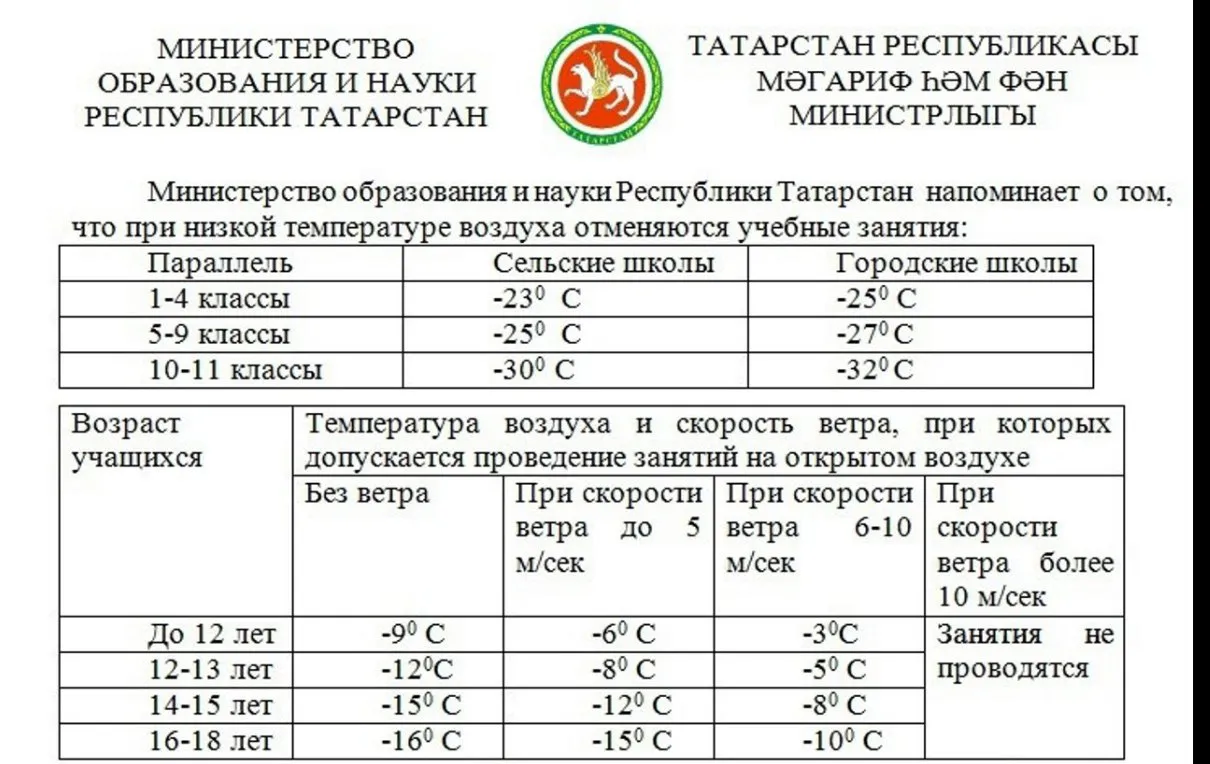 В связи с установившейся морозной погодой в Татарстане Минобрнауки РТ предоставило информацию о том, при какой температуре должны быть отменены учебные занятия в школах республики.