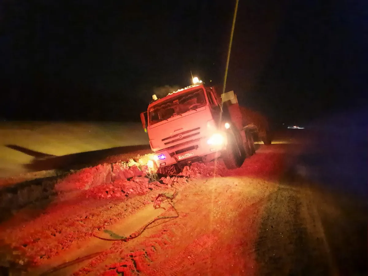 Спасатели на дорогах: сотрудники ГИБДД вытащили из сугроба КАМАЗ с прицепом
