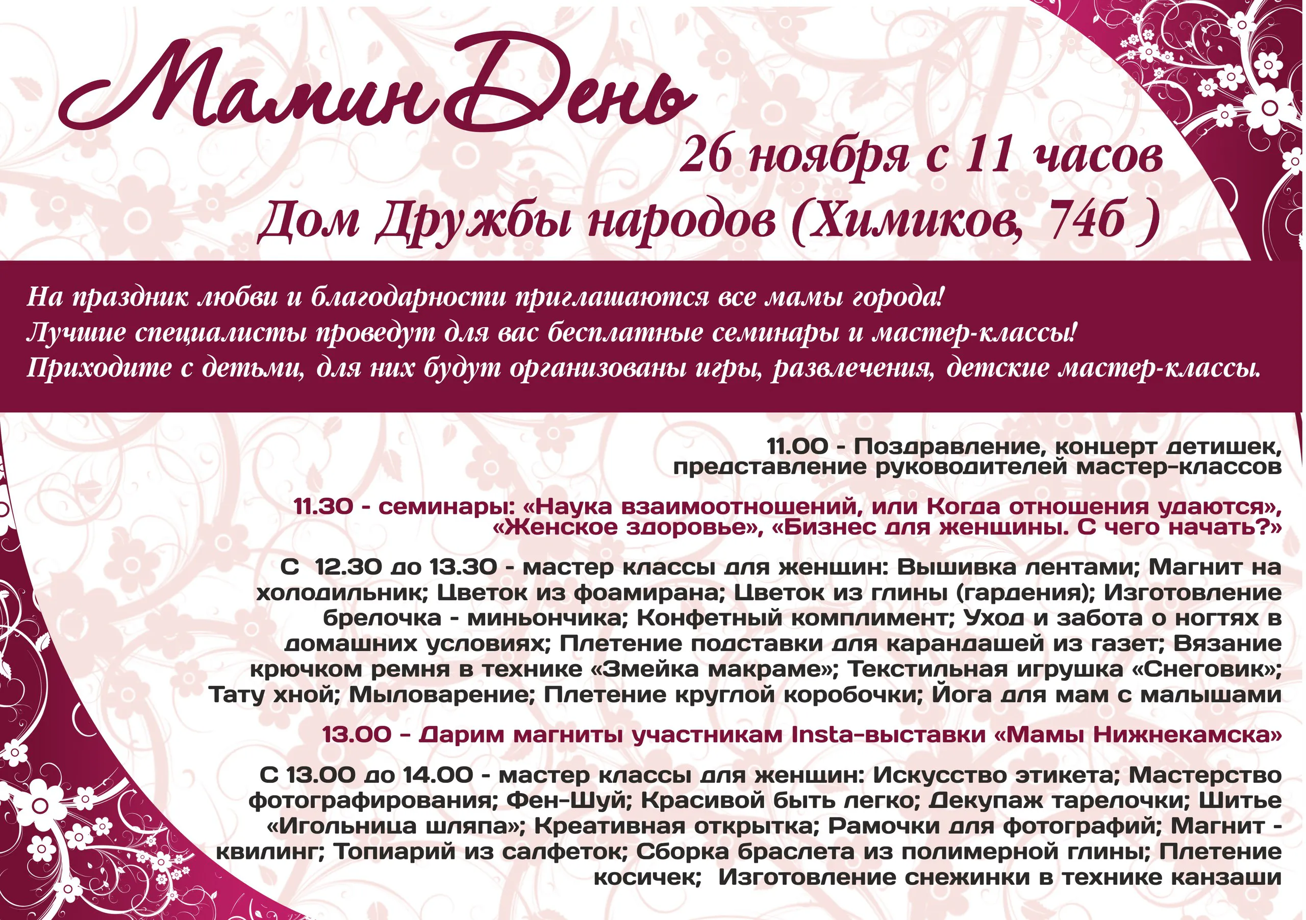 26 ноября с 11:00 до 14:00 в Доме дружбы народов по адресу: проспект Химиков, 74б состоится традиционный праздник «Мамин день – праздник любви и благодарности», сообщает сайт НМР.Он проводится уже третий год по инициативе общественной организации «Женщины Нижнекамска». В рамках праздника участников ждут концерт, семинары «Наука взаимоотношений», «Женское здоровье», «Бизнес для женщины», а также фестиваль мастер-классов.Своим мастерством готовы поделиться известные в городе профессионалы. Можно будет получит