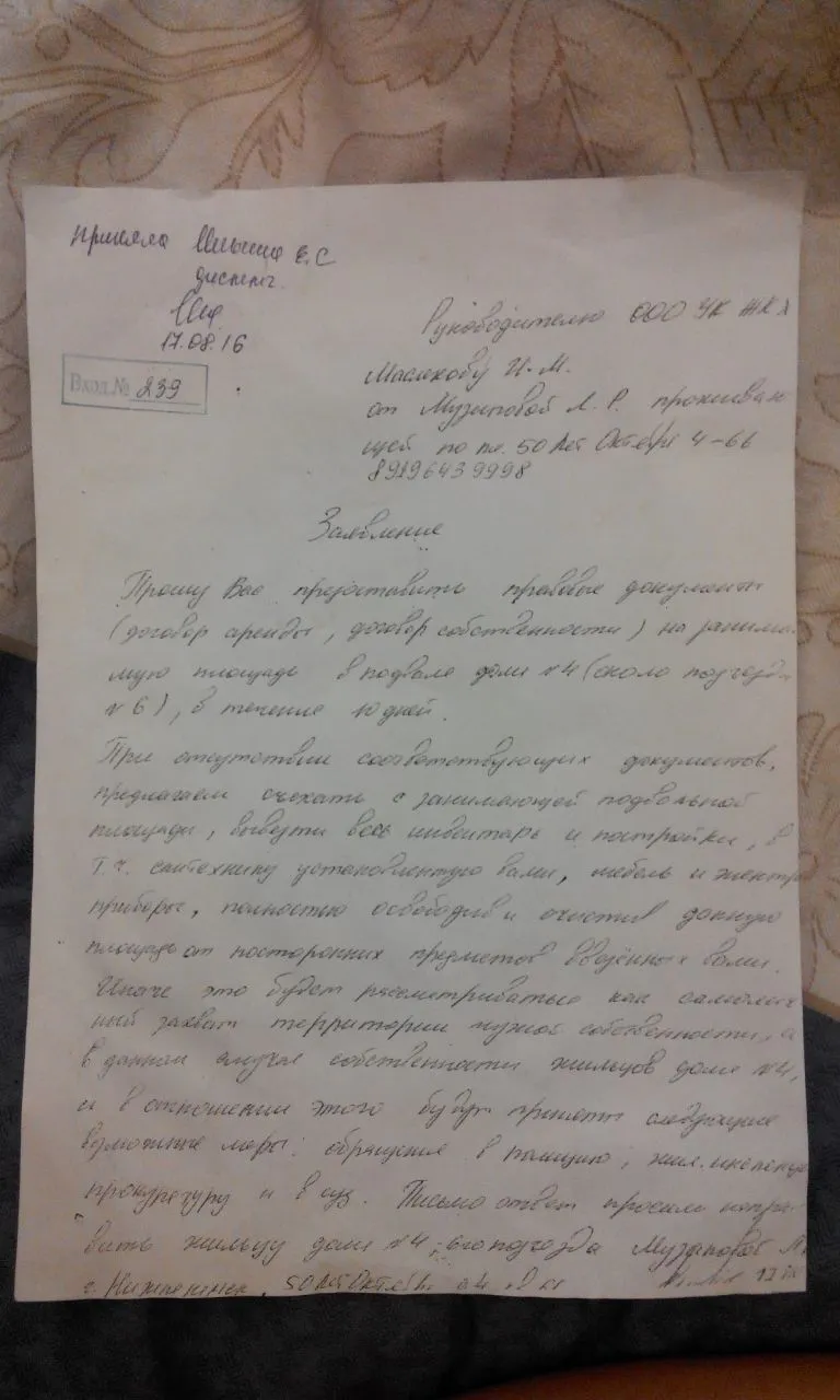 Этот самопроизвольный захват территории собственности жильцов нашего дома. Мы в данный момент готовим письмо в прокуратуру с просьбой провести проверку нахождения данного УК в нашем подвальном помещении.