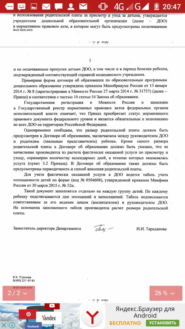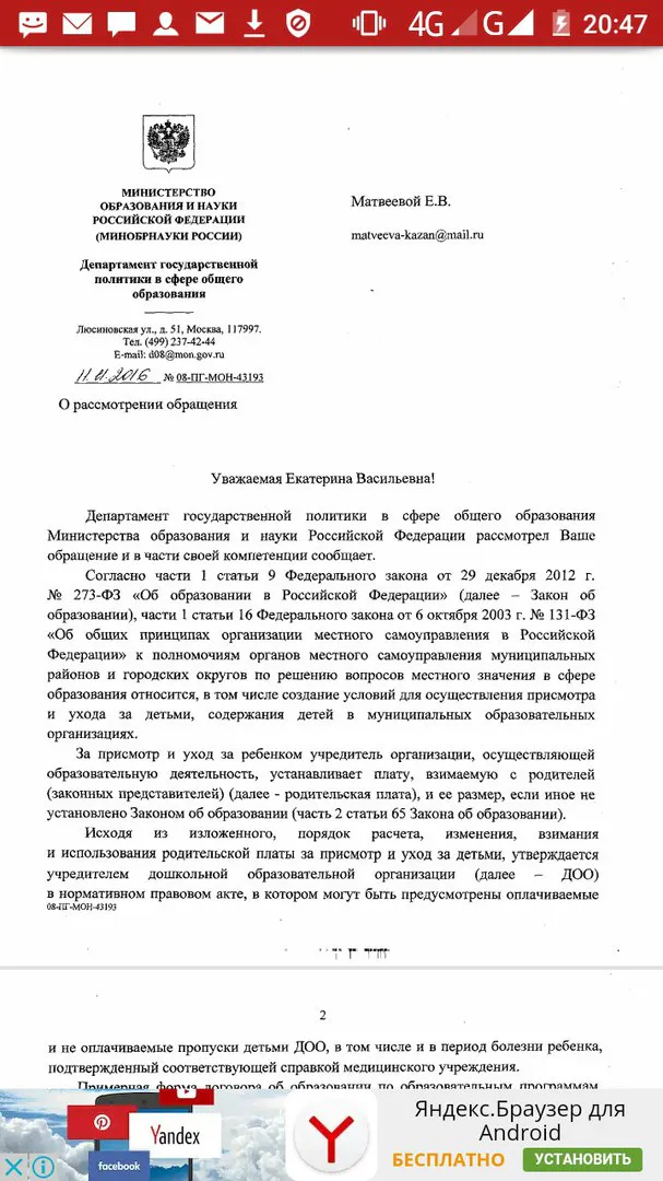 Здесь же она выложила ответ из Департамента государственной политики в сфере общего образования Минобрнауки России, который получила 11 ноября 2016 года.