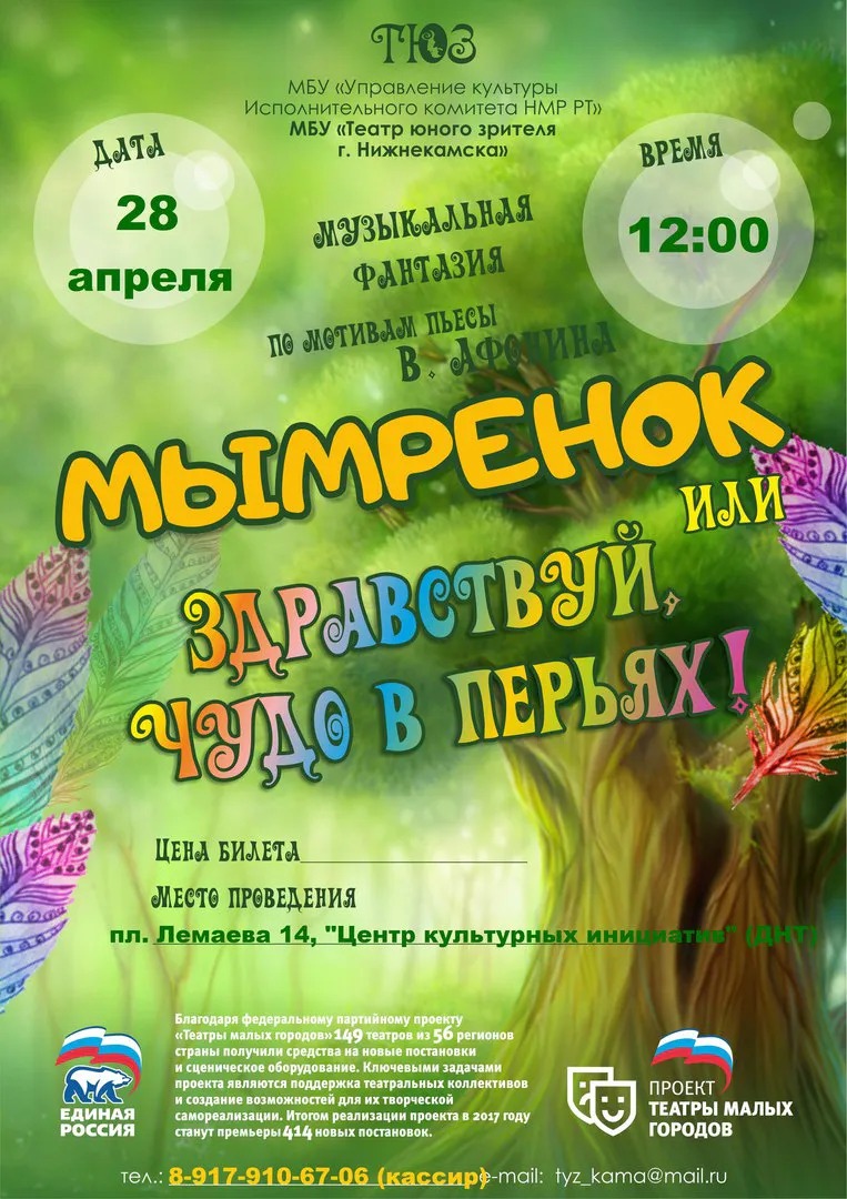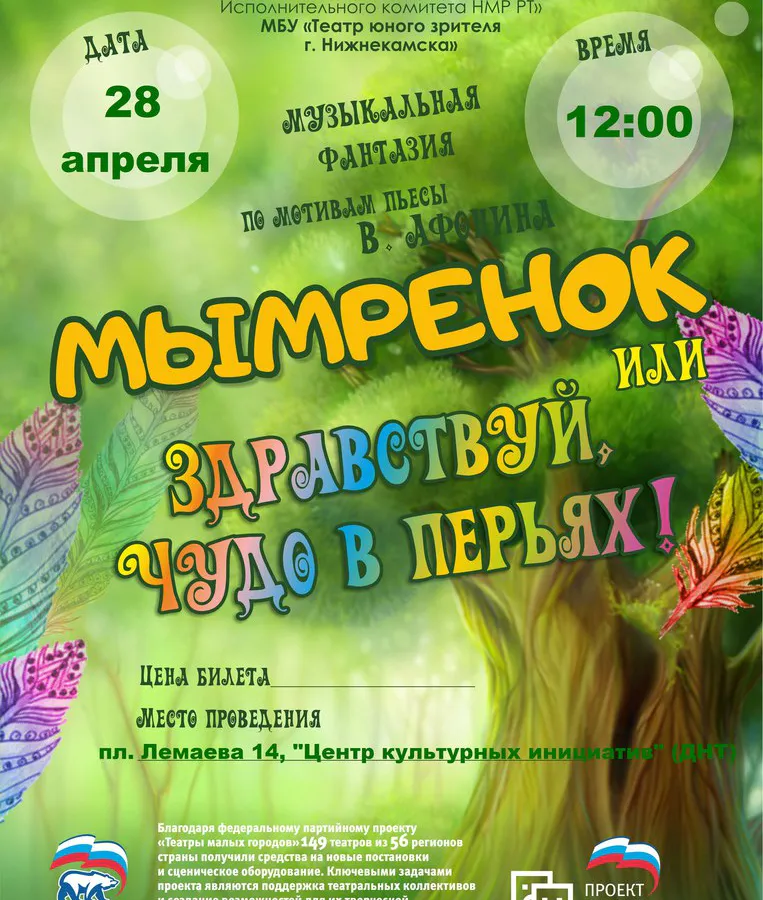28.04 - суббота"Мымренок" 6+По пьесе В. АфонинаСмешная история симпатичных, но невоспитанных мымров-домоседов донесет до вашего ребенка мысль о пользе этикета и научит культуре общения в семье.