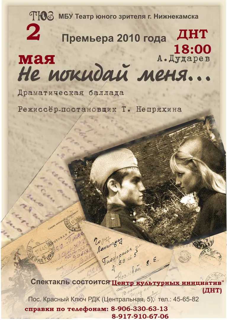 28.04 - суббота"Мымренок" 6+По пьесе В. АфонинаСмешная история симпатичных, но невоспитанных мымров-домоседов донесет до вашего ребенка мысль о пользе этикета и научит культуре общения в семье.02.05 - среда"Не покидай меня..." 16+по пьесе А. ДудареваЭто история о молодых девчонках-разведчицах, брошенных волею судьбы в самое пекло войны. Девочки смеются и плачут, и живут, пока есть солнце и нынешний день, пока есть мечты.Все спектакли состоятся на сцене "Центра культурных инициатив" (ДНТ)Справки и бронирован