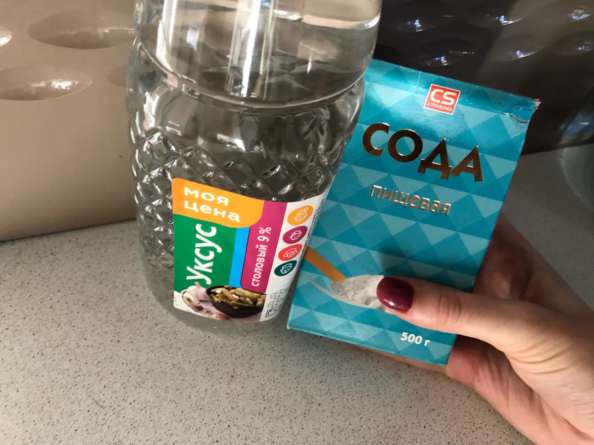 Сочетание теплого столового уксуса, пищевой соды и спиртового раствора йода способствует растворению минеральных отложений, удалению загрязнений и дезинфекции поверхностей.
